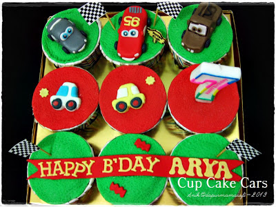 Langsung nanya apa bisa kalau tanggal 2 februari membuatkan cup cake set bertema apa saja asal cowok untuk acara ulang tahun putra keduanya yaitu Arya, dan ketika saya tawarkan Cars bu Rini nya langsung setuju.